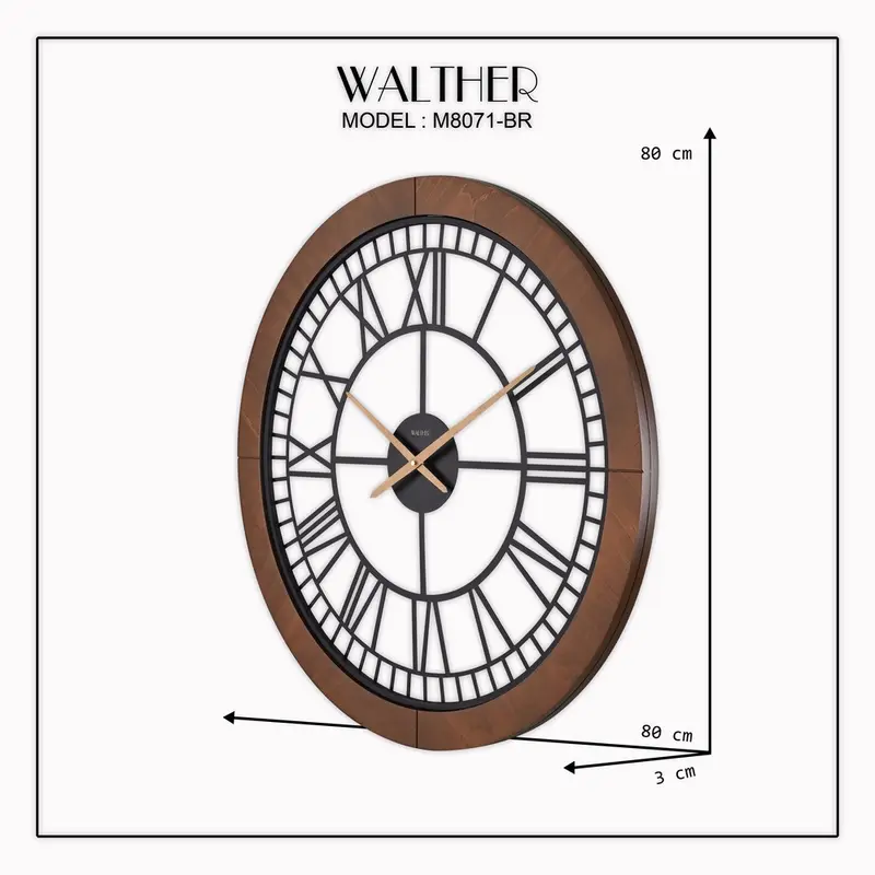 این ساعت دیواری با طراحی بسیار زیبا و مینیمال برای شما موجود شده است. همچنین باید این نکته را بیان کنیم که این ساعت در چهار رنگ یعنی قهوه ای تیره و روشن و رنگ کرم و خاکستری برای شما موجود شده است. در این بخش برای شما رنگ قهوه ای تیره را در دسترس قرار داده ایم. همچنین رنگ کرم این مدل هم از قسمت ساعت دیواری والتر 8071 رنگ کرم در دسترس است. اعداد رومی که به زیبایی طراحی شده است به همراه رگه های طبیعی چوب روی بدنه، این محصول را به یک ساعت دیواری مدرن تبدیل کرده است. سایز 80 این ساعت، باعث میشود که در فضاهای گسترده، این ساعت به مهمترین اکسسوری محیط تبدیل شود.